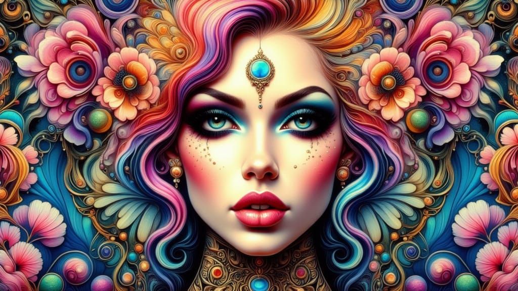 This image presents a captivating retro-futuristic pin-up girl with large, expressive eyes and a curvaceous figure. Rendered in vibrant colors with high detail, it evokes classic Hollywood glamour with a fantasy twist.
