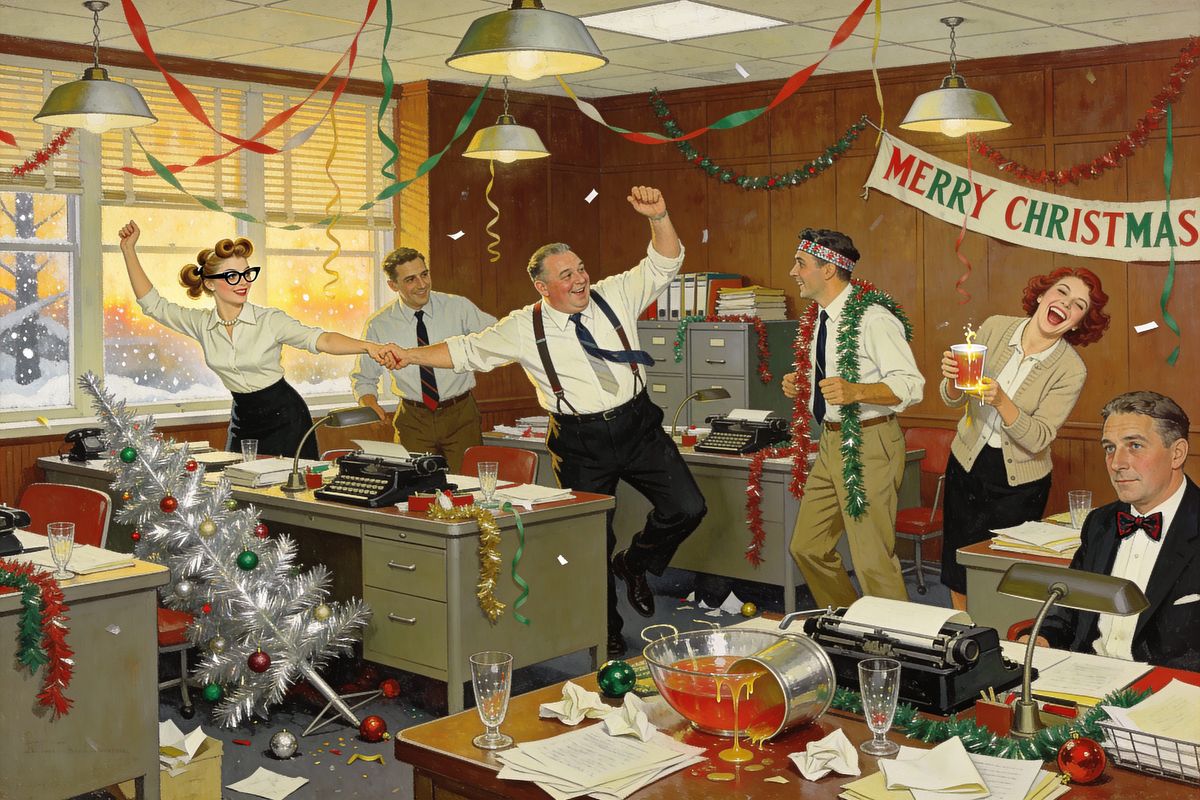 This image captures a 1950s office Christmas party in joyful disarray, with employees dancing and celebrating amidst festive decorations and scattered office supplies. A vintage scene of holiday revelry.