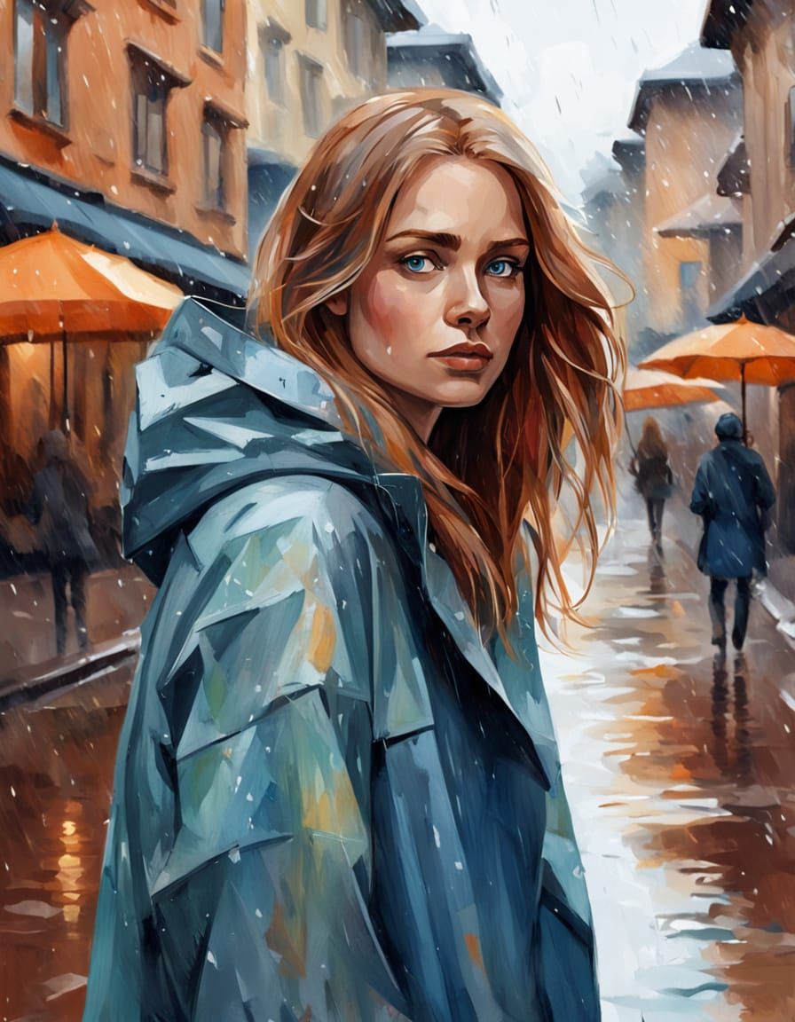 This image shows a girl in a terracotta raincoat walking in the city in an expressionist painting style. Soft brushstrokes and vibrant terracotta and blue hues create a warm, inviting scene.