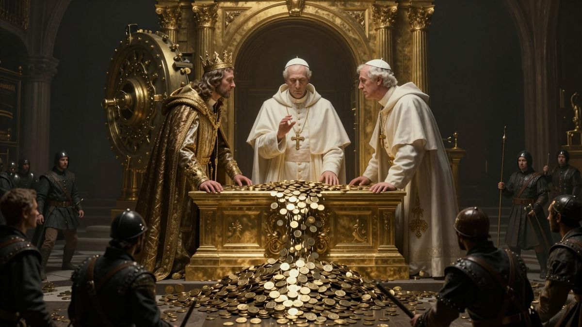 This hyper-detailed image shows a shadowed altar as a treasury vault. Leaders conspire while coins dictate actions, and dissenters face economic exile in a photorealistic dystopian concept art style.