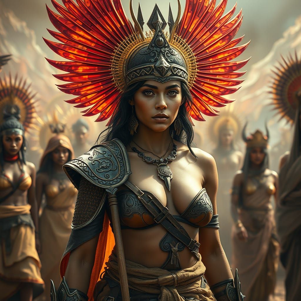 A striking picture of a woman with ceremonial armor, her chest bare, standing in a gathering of diverse people. The digital artwork features realistic and fantastical elements with vivid lighting.
