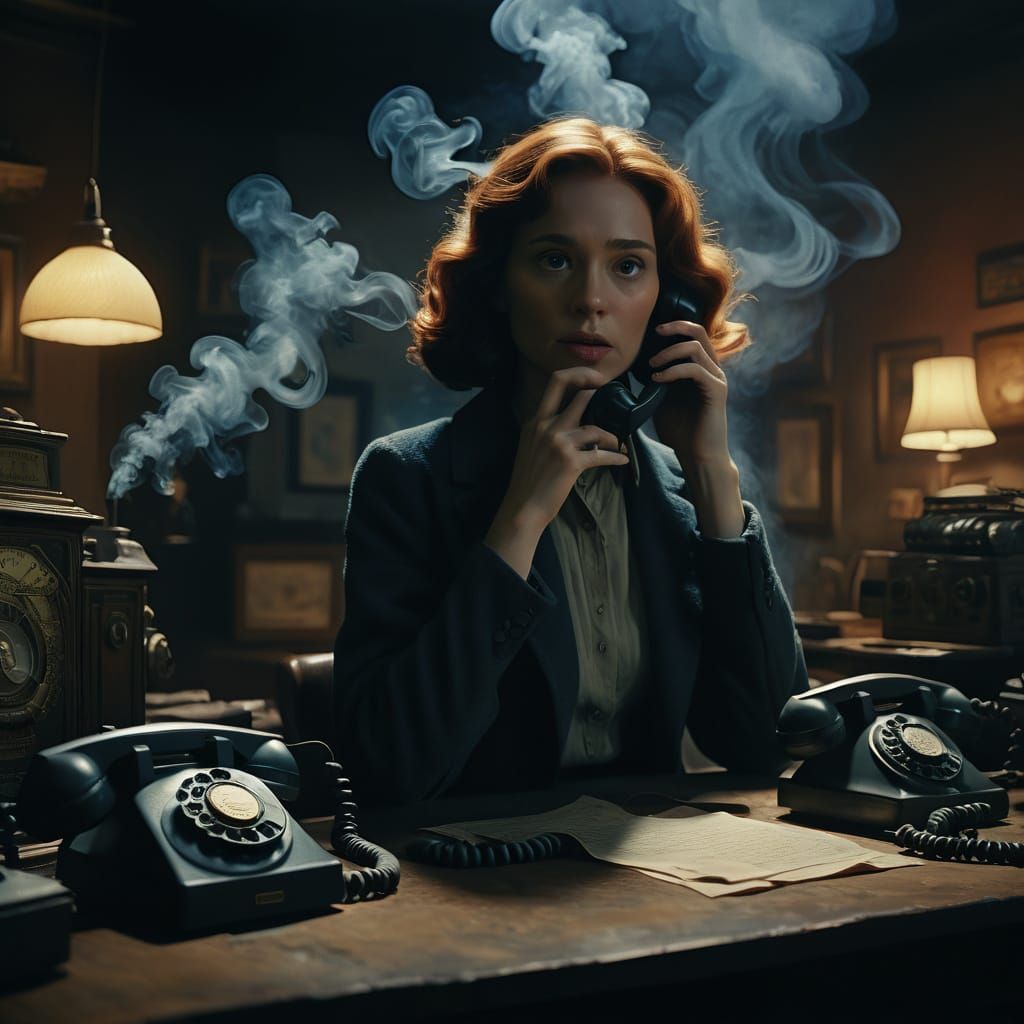 A cinematic film still of a mysterious figure surrounded by old telephones in a dimly lit, smoke-filled room, with vibrant, muted colors and warm golden lighting.