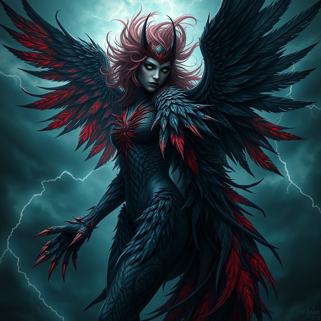 This striking image depicts a dark fantasy character, a corrupted human-phoenix hybrid with tattered wings and glowing green eyes, set against a stormy, lightning-filled sky in a cinematic style.