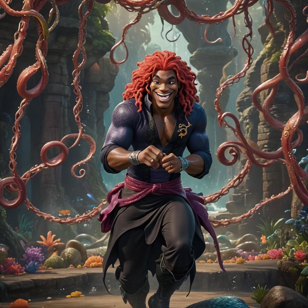 This image shows a hyperdetailed, 8k rendering of a handsome, shirtless black male character with tentacle legs, reminiscent of a Disney Renaissance animation. The figure has glowing blue eyes and white hair.