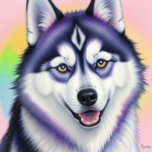 This watercolor painting features a close-up of a husky dog with intricately patterned, tie-dyed rainbow fur. The artwork showcases a soft blend of pastel colors and gentle lighting, presented in a detailed quilling art style.