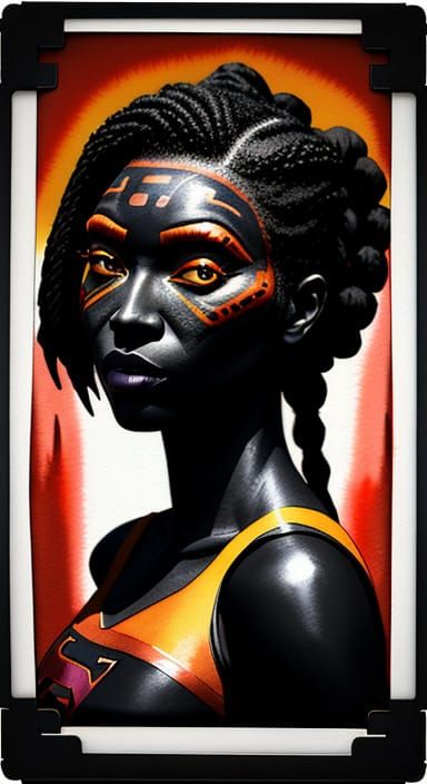 This image shows a lady jungle explorer with a tribal hairstyle, set against an Amazon backdrop. The scene is rendered in supergraphic ultramodern watercolor, reminiscent of a polaroid photo.