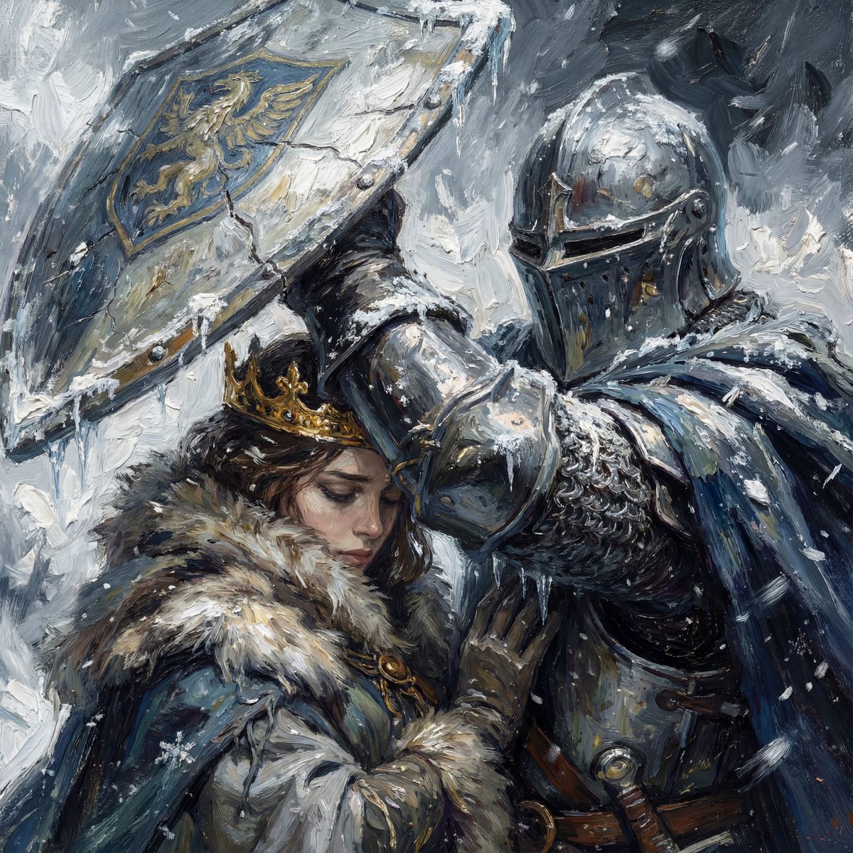 This image shows a noble knight shielding his queen from a harsh, snowy storm in a grimdark fantasy style. The painting uses impressionistic techniques to convey the dramatic scene.