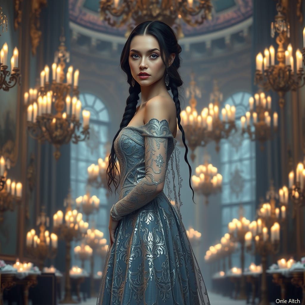This enchanting image shows a regal gothic tsaritsa in a resplendent silver gown, surrounded by the mystery and foreboding of a grand, snow-encrusted palace ballroom, in a Pre-Raphaelite style inspired by the works of Dante Gabriel Rossetti and John William Waterhouse
