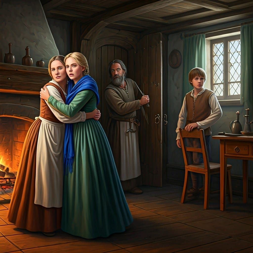 A family of four prepares for unknown danger, huddled together in a dimly lit medieval room. The father stands guard, while the mother and daughter cling to each other in fear, and a teenage son looks out the window, illuminated by faint daylight.