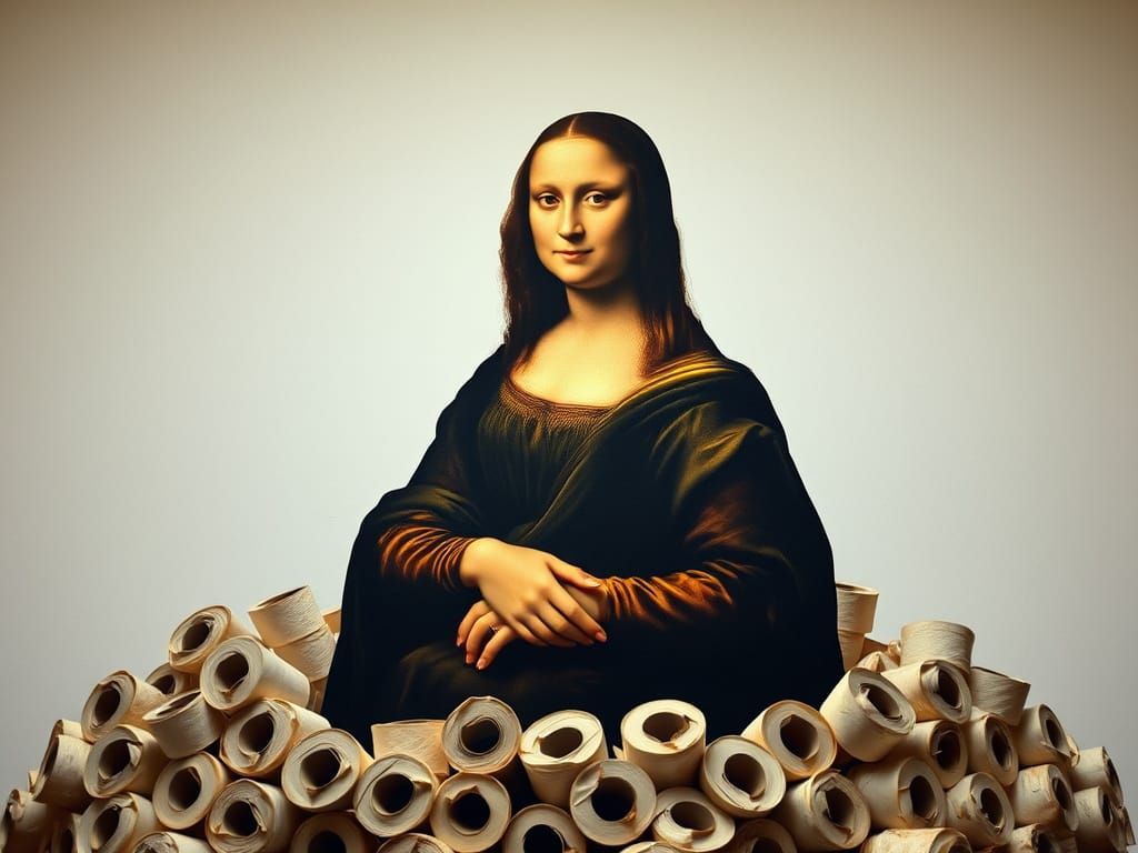 This image shows the Mona Lisa sitting atop a tower of toilet paper rolls. The artwork blends classical portraiture with everyday objects in a surreal style.