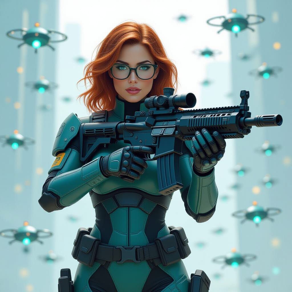 A photorealistic image of a woman with hazel hair wearing glasses and futuristic tactical armor. She's surrounded by glowing nano drones and holding a pulse rifle, in a retro science fiction aesthetic.