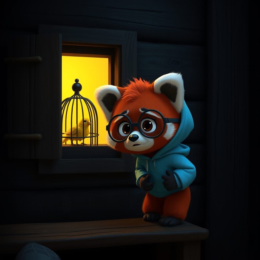 This image shows a haunting nighttime scene of an old wooden house, where a tiny bird sits in a birdcage, while a curious red panda peers through the window, creating a moody and atmospheric cinematic scene, reminiscent of classic animation styles.