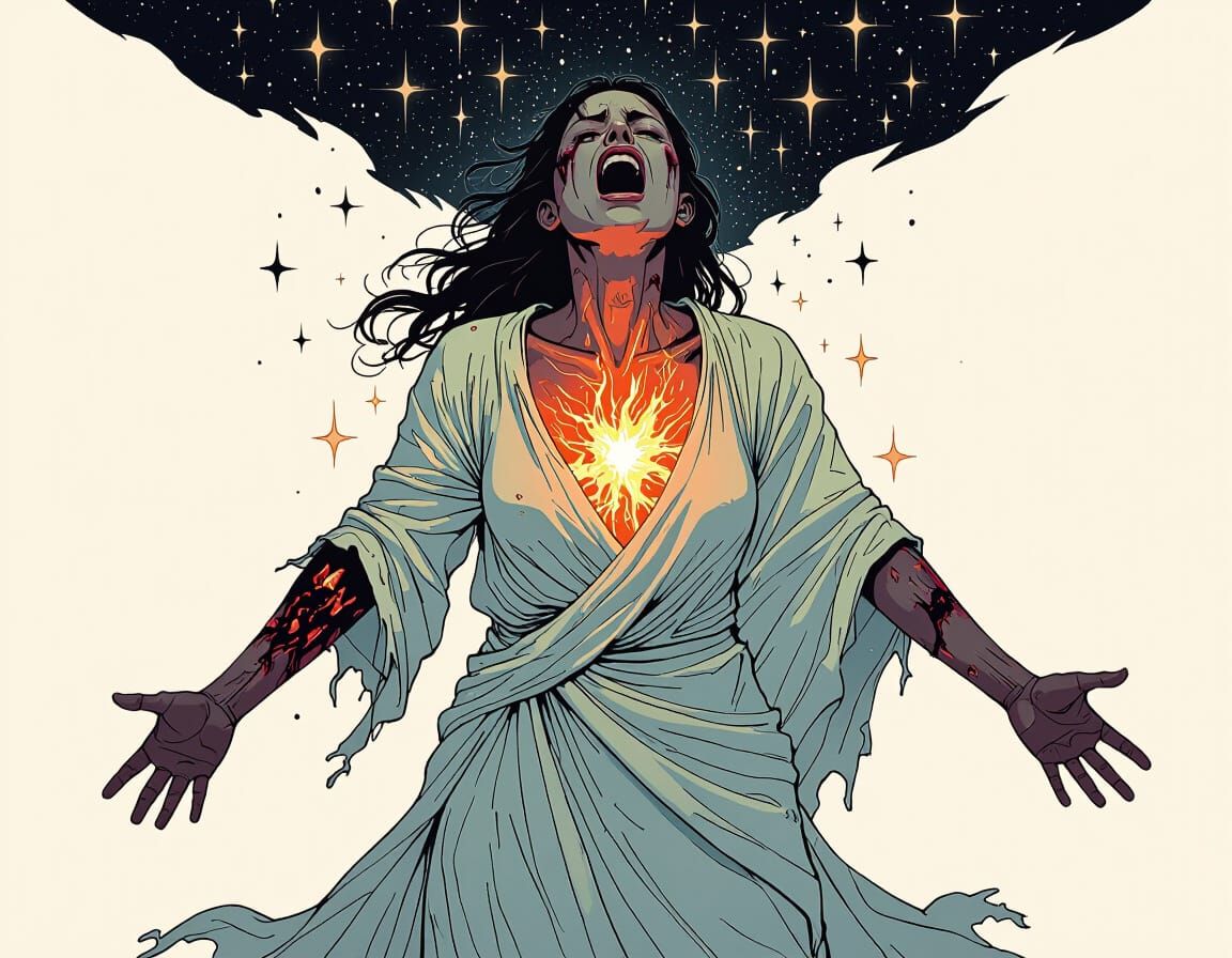 This image shows a woman floating in space, engulfed in cloth. Her body is burned, radiating light, and she is surrounded by stars. The aesthetic is reminiscent of a dark beat'em-up game.
