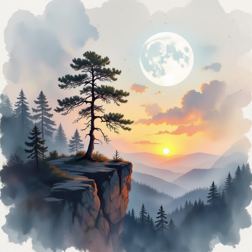 This image shows a ghostly oak tree on a cliff at sunset. The artwork features blurred watercolor effects, double exposure, and a sketch-like style with transparent lines, reminiscent of atmospheric watercolor art.