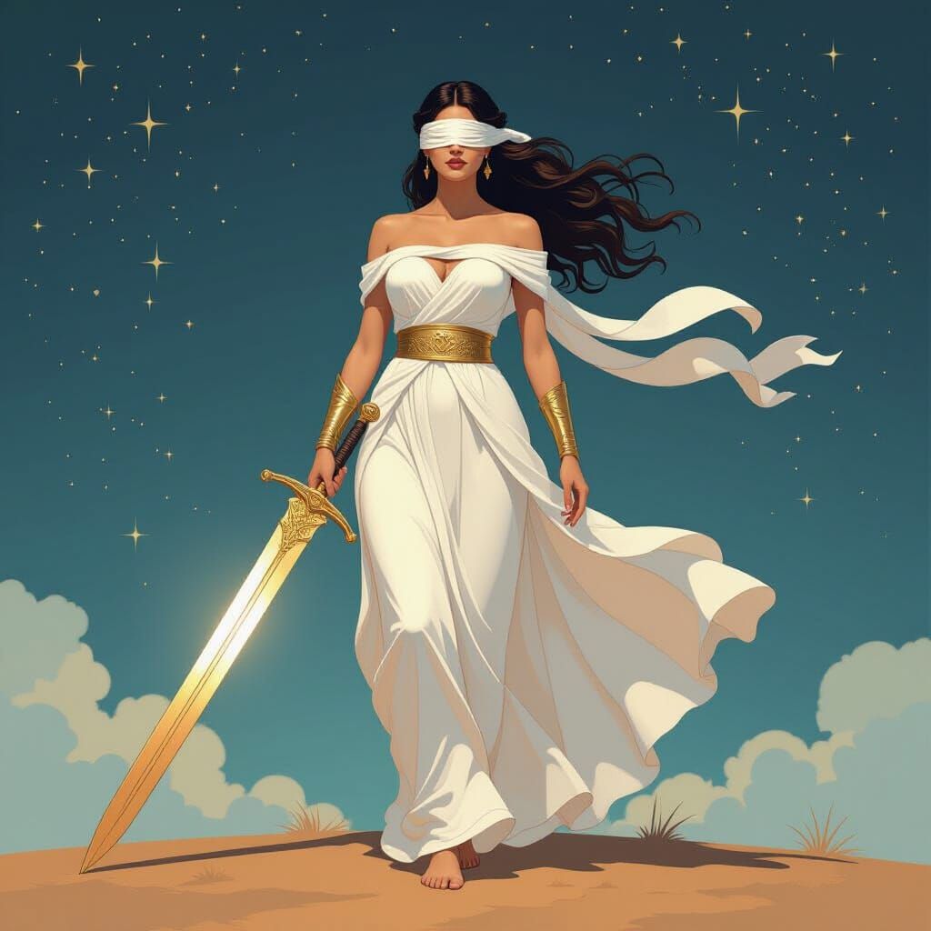 A captivating image of a blindfolded goddess embodying Libra. She wears a flowing white dress, holds a sword, and stands against a dark, starry backdrop. Digital watercolor art with surreal and expressionist elements.