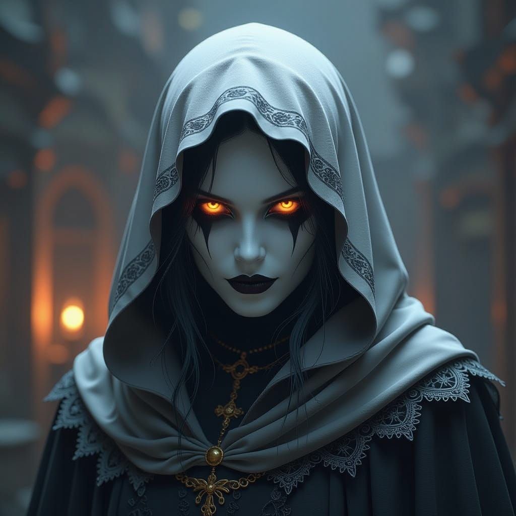 A detailed head and shoulders portrait of a Halloween ghost, rendered in a dark gothic vintage artistic style with ethereal wisps and glowing eyes. Dynamic lighting and triadic colors create a moody atmosphere.
