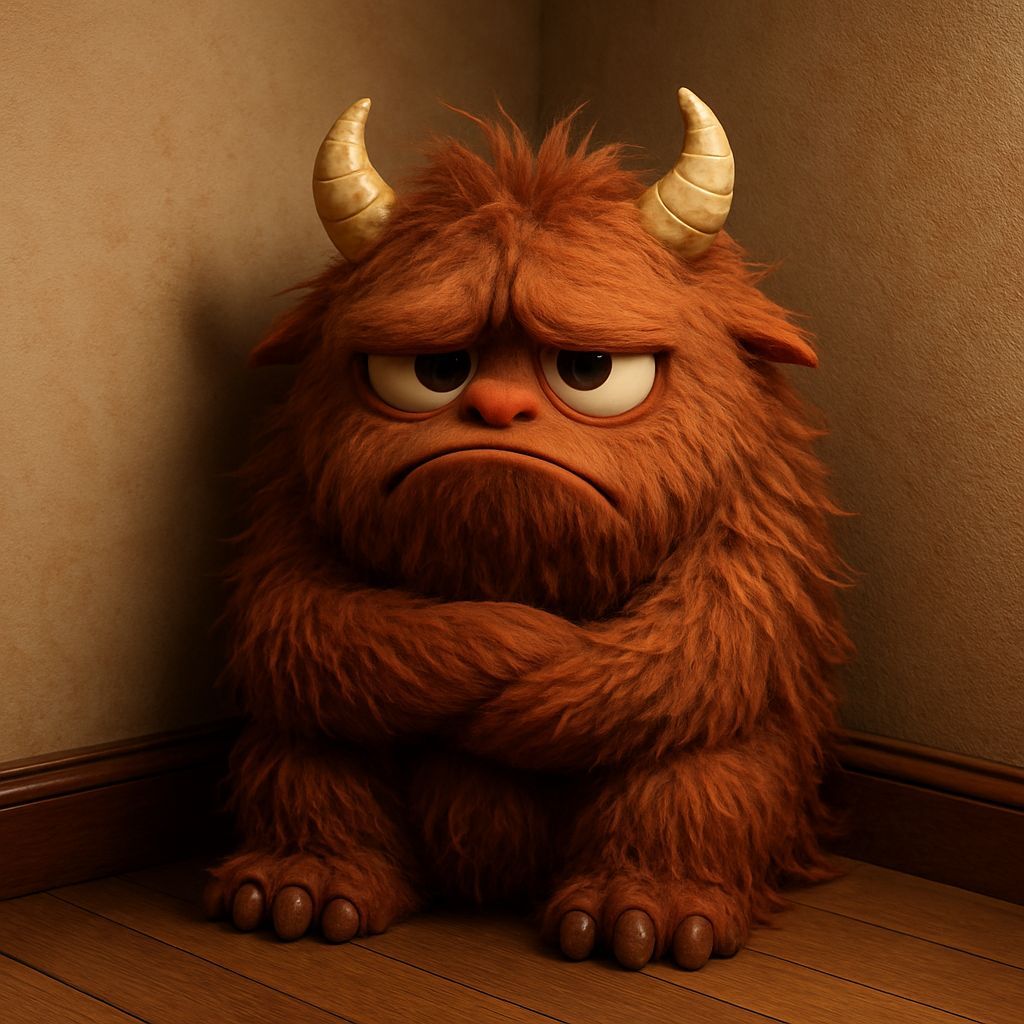 This image shows a sulky, hairy cartoon monster in CGI style, sitting in the corner for time out. The adorable creature is rendered with high detail.