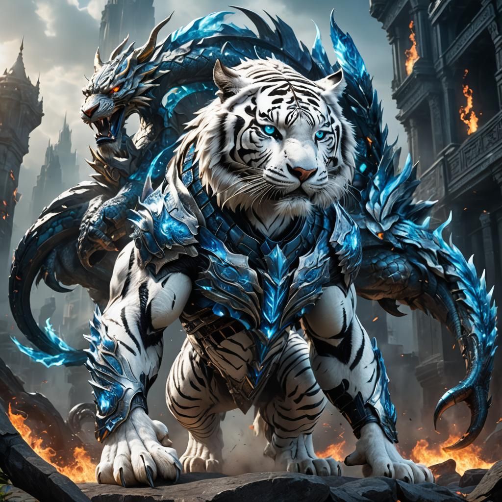 This image shows a hybrid creature with the body of a muscular human, the head of a dragon, and the features of a white tiger, clad in silver armor amidst blue flames. Rendered as detailed fantasy art.