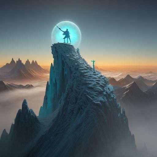 This image shows a lone figure in an elaborate costume standing on a mountain peak. Golden sunlight illuminates the delicate fabrics, set against icy mists and deep turquoise and burnt orange hues, as high-quality fantasy concept art.