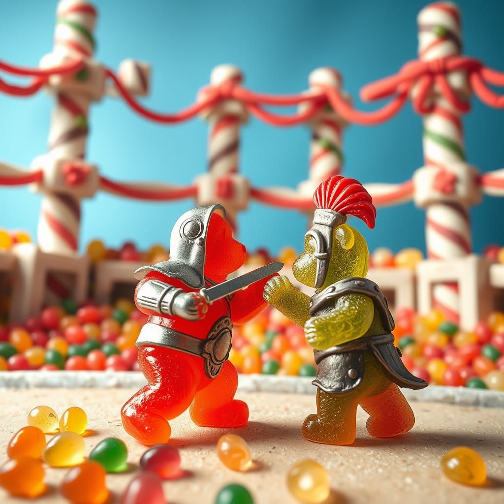 A whimsical image of two gummy bear gladiators fighting in a candy coliseum. The scene is vibrant and colorful, reminiscent of digital art.