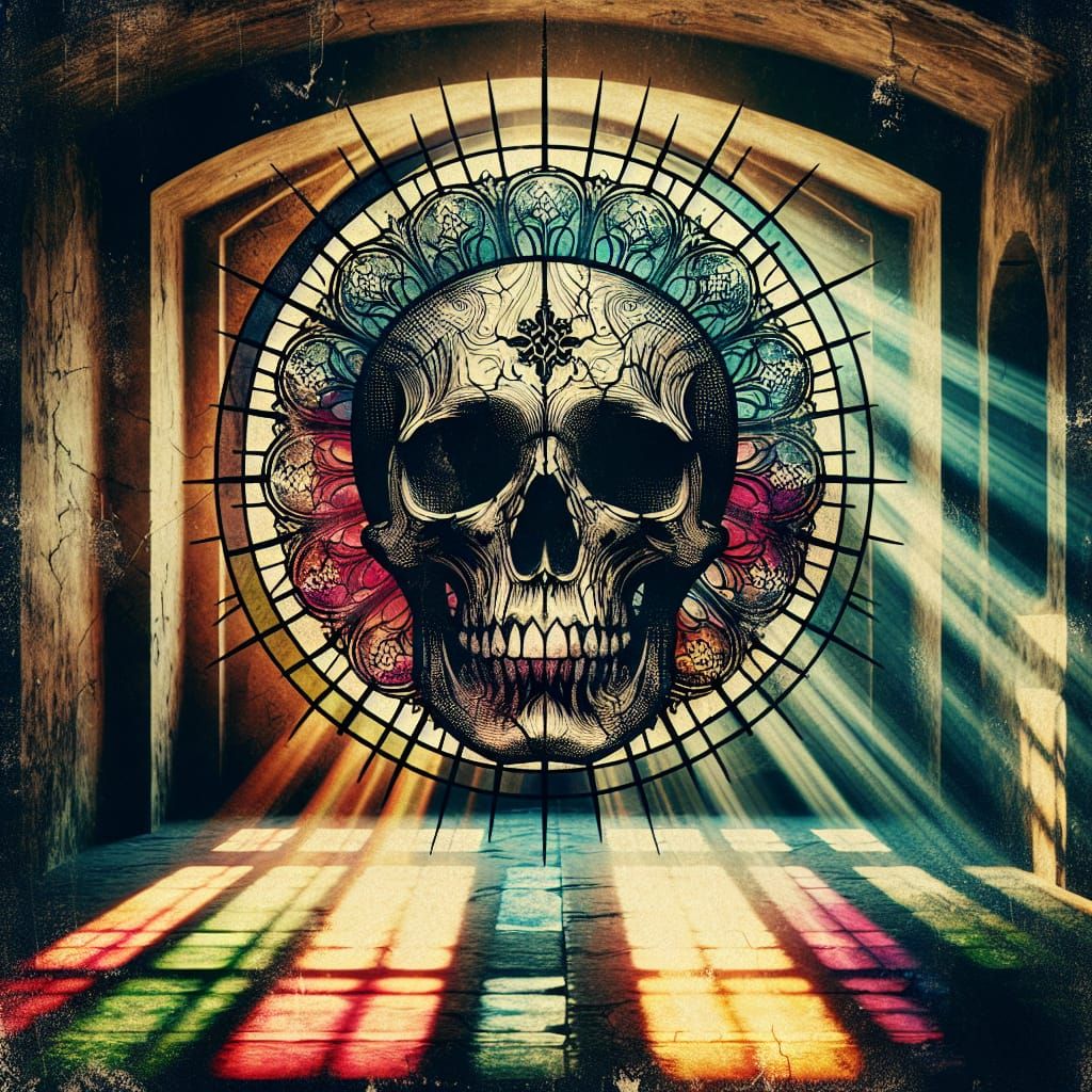 A weathered grunge skull is featured in an aged, damaged stained glass window. Sunbeams filter through, casting vibrant colors and creating an atmosphere of mystery and antiquity.