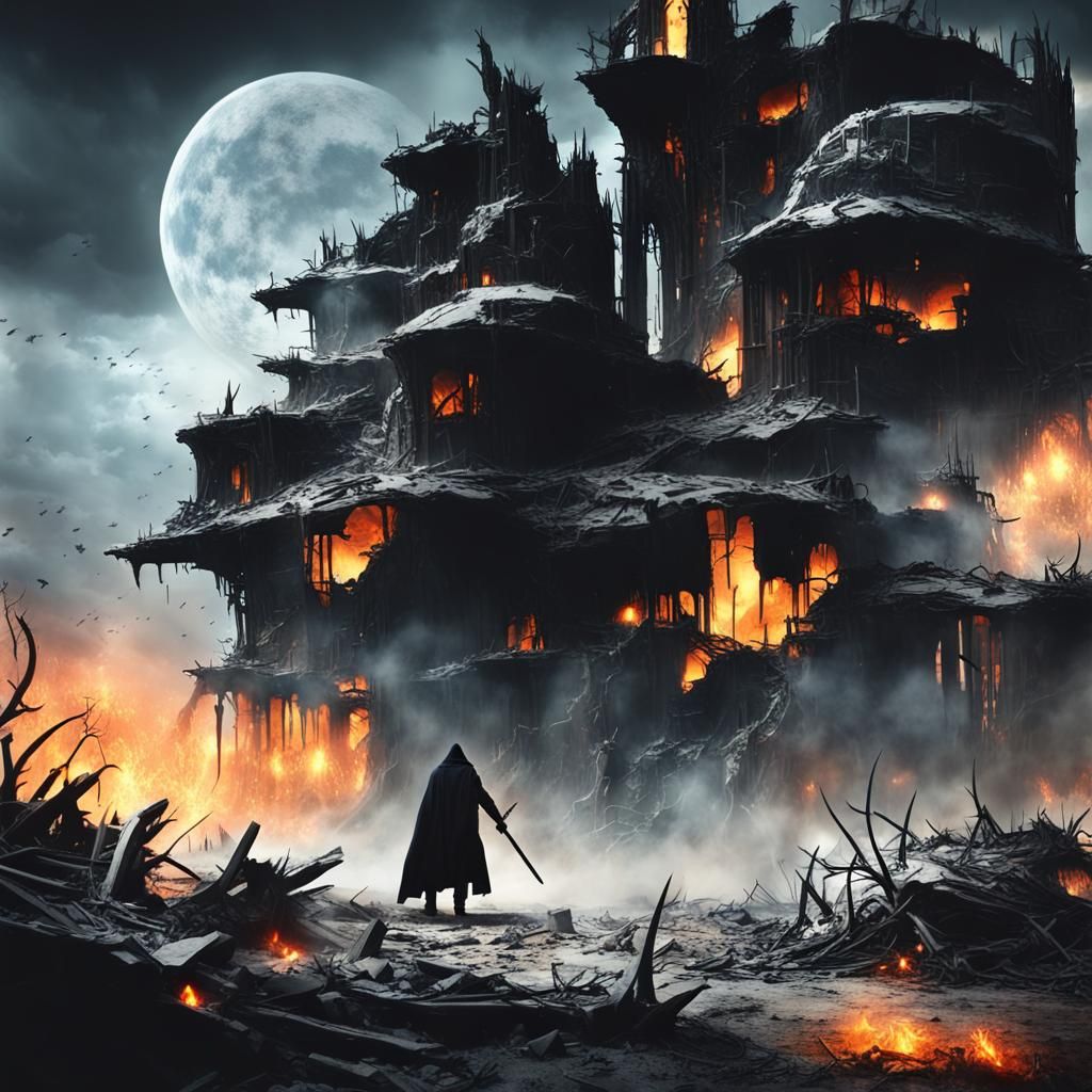 A dramatic image of a ruined fantasy landscape engulfed in magical chaos. Fires and lightning illuminate the scene, presented in a dark, post-apocalyptic style.