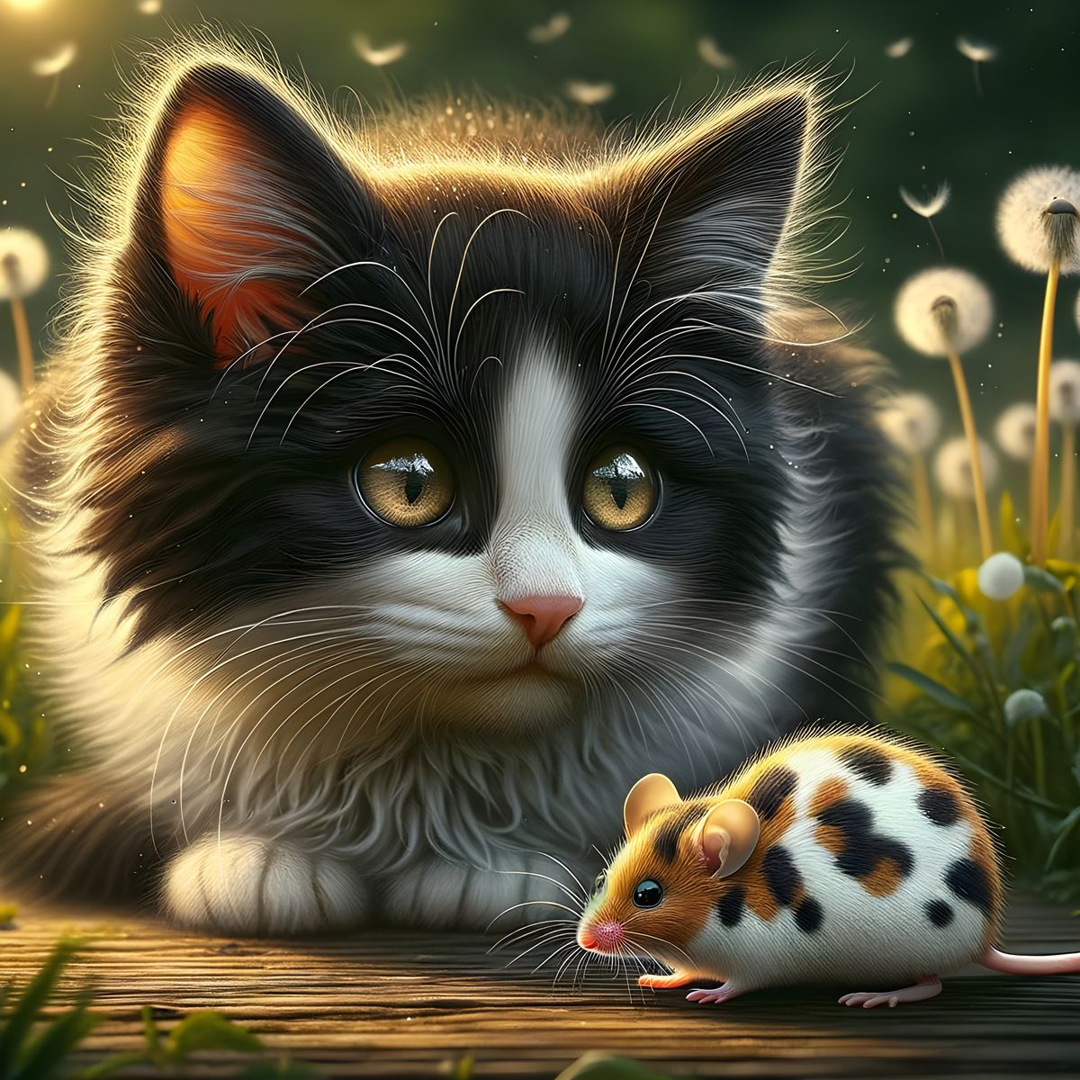 This photorealistic digital painting captures a curious tuxedo kitten tilting its head at a fuzzy piebald mouse. Dandelions and warm light create a magical outdoor scene with exquisite detail.