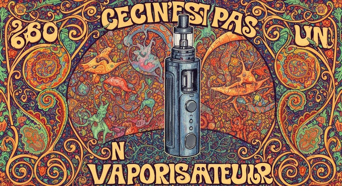 This image is a vibrant psychedelic poster featuring a vaporizer and surreal text. It blends 60s art, Op Art, and Pop Art with intricate, contrasting colors and patterns.