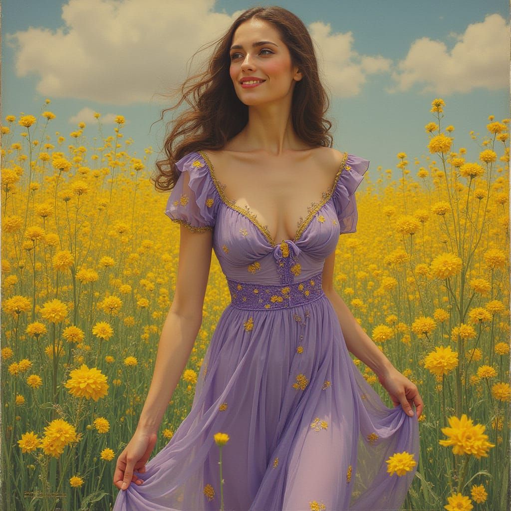 A serene European woman with flowing blonde hair walks along a flower-lined path, smiling radiantly. She wears a light purple dress embroidered with yellow flowers, in an art nouveau style.