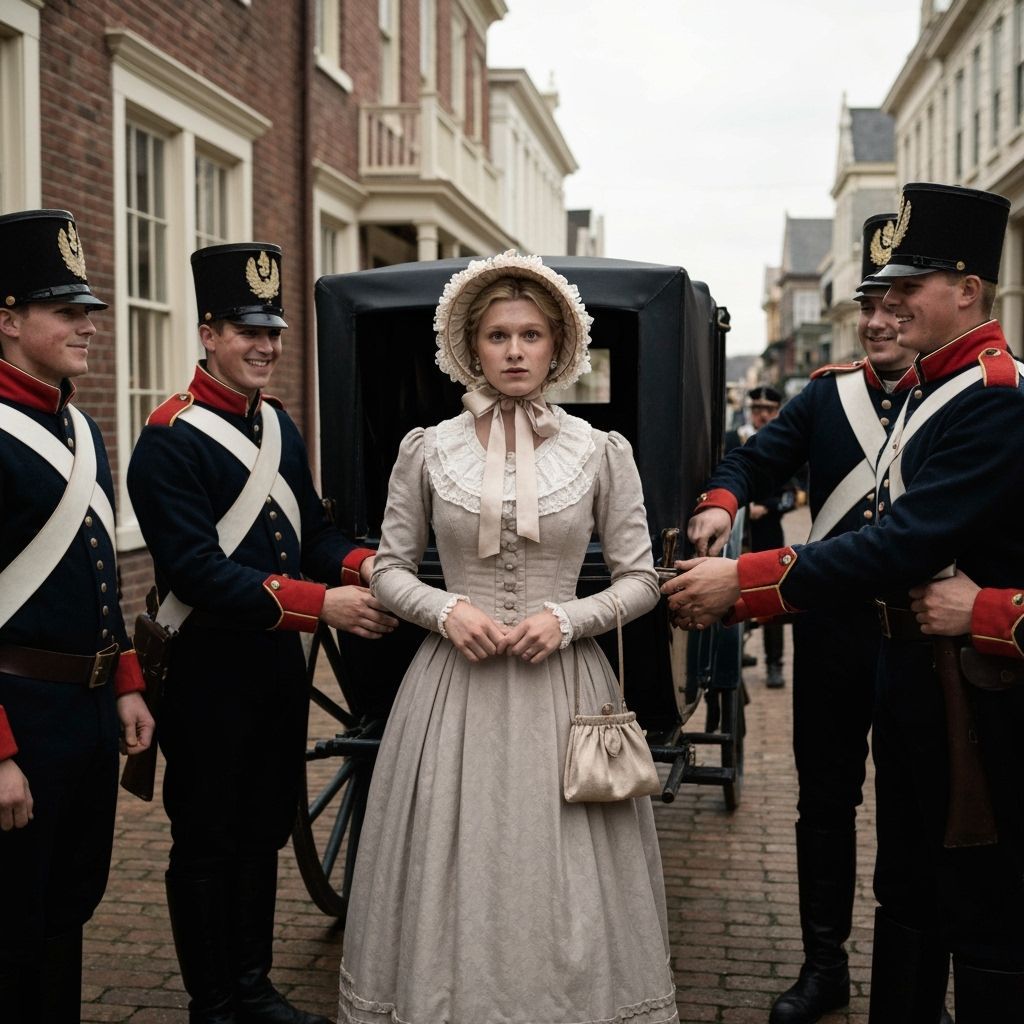 This cinematic film still captures a blonde young man, mistakenly identified as a lady, in a frilly 19th-century outfit. Soldiers assist him into a carriage, creating a dramatic and atmospheric scene.