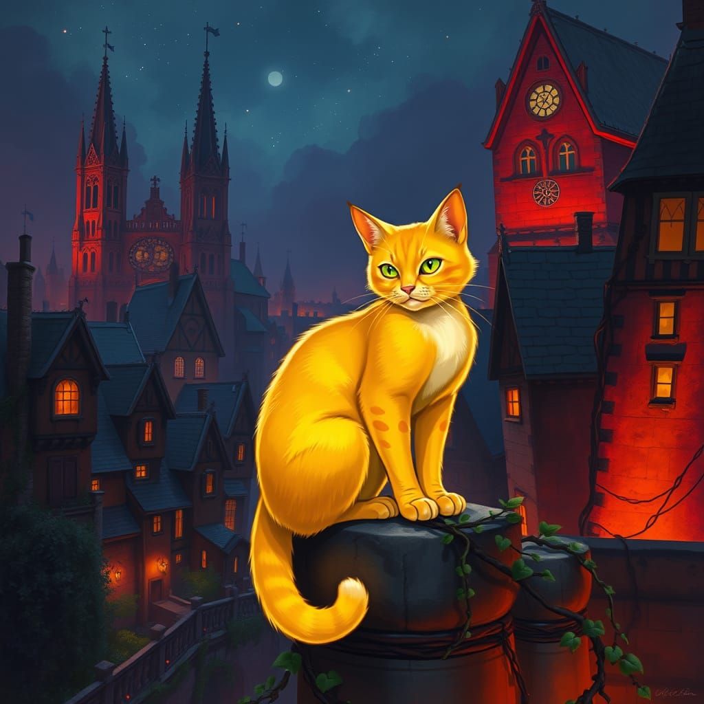 A vibrant image of a yellow cat with glowing fur and green eyes sitting on a ledge. The backdrop features a medieval town with a gothic cathedral under a starry night, in a fantasy art style.