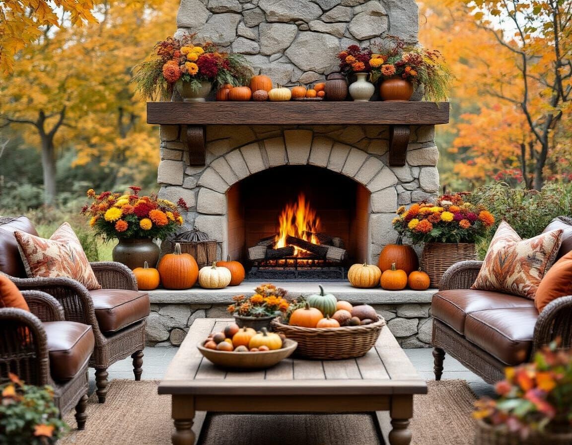 outdoor stone fireplace, autumnal decor, hyperrealistic, cozy, rustic, wooden furniture, brown, beige, red, orange, and yellow tones, stone fireplace with a fire burning inside, fall foliage and colorful flowers arranged on mantelpiece and around fireplace in various vases and baskets, various ...