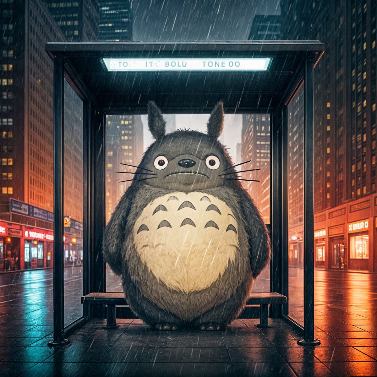 This image shows a rain-soaked Totoro waiting for a bus in a gritty city, surrounded by grey skyscrapers and vibrant neon lights.