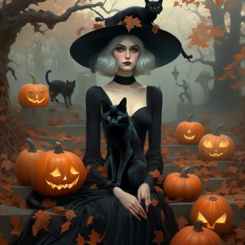 This AI-generated image depicts a tragic Halloween witch with a giant black cat, rendered in a detailed, maximalist matte painting style with dark hues.