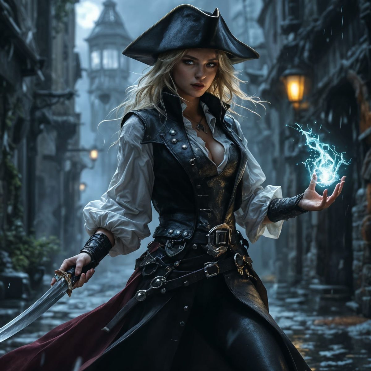 This image shows a dynamic female Gloomstalker Ranger in mid-combat, illuminated by the faint glow of city lights in a dark alleyway. The artwork features a mix of medieval and fantasy elements, with intricate armor and a striking color palette.