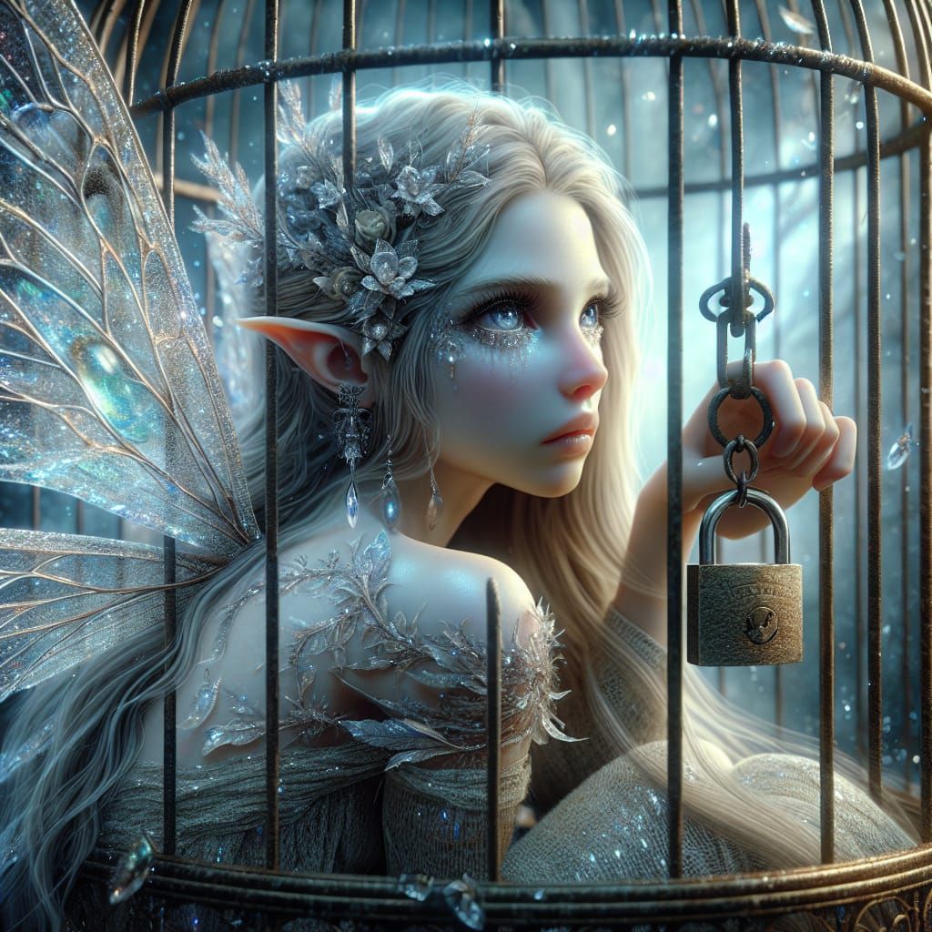 This image shows a beautiful fairy with crystal wings, trapped in a locked birdcage. The artwork blends classical elegance with modern fantasy, emphasizing intricate details and magical realism.