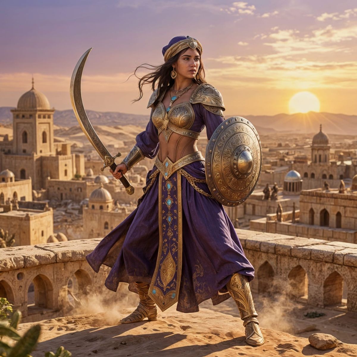 This image shows a heroic female warrior in desert armor and flowing robes, wielding a scimitar and shield on a balcony. Overlooking a city at sunset, it features dramatic lighting and Middle Eastern fantasy aesthetics.