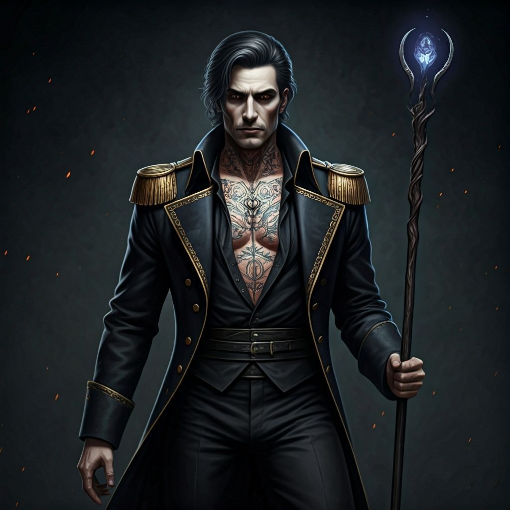 A striking image of a dark, elegant figure in a French military coat with gold accents, adorned with mystical tattoos and holding a runic staff. Features dramatic lighting and intricate detail.