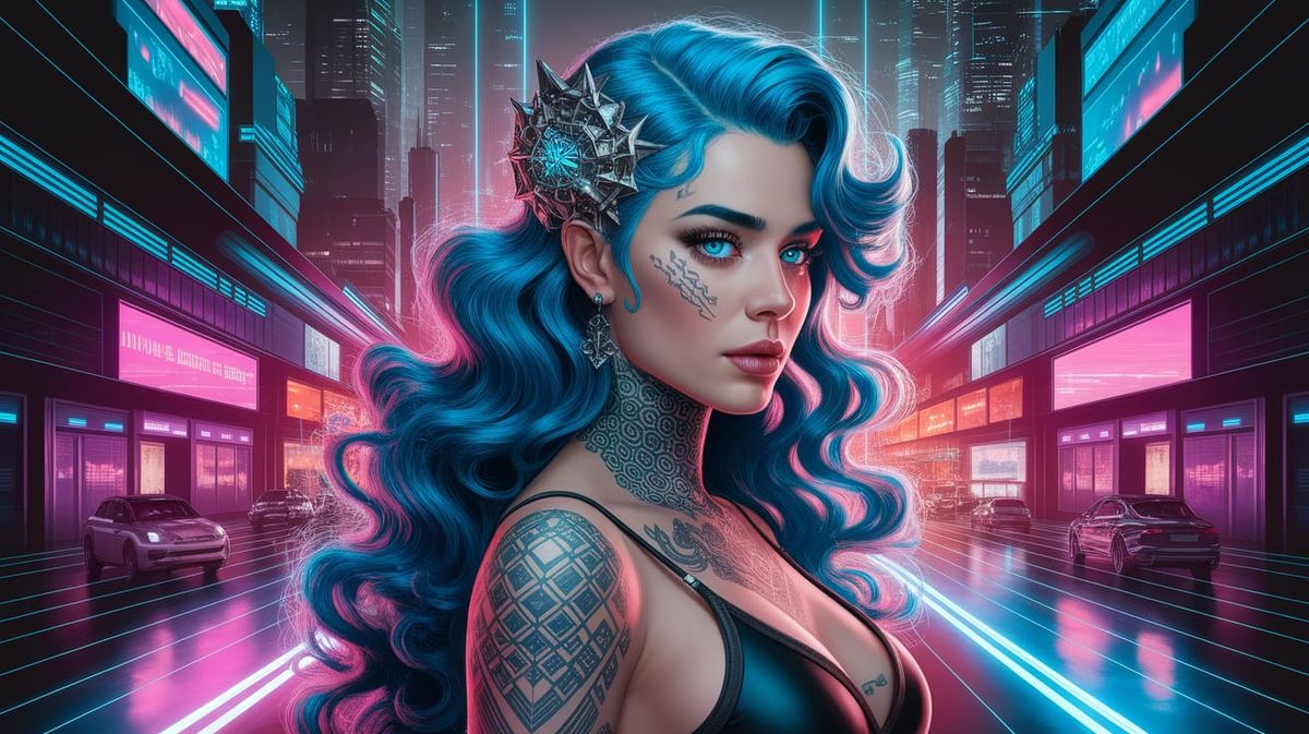 A vivid portrait of a woman with flowing blue hair and geometric tattoos, against a futuristic cityscape. The artwork blends art deco and cyberpunk styles, using electric blues and pinks to create a technological aesthetic.