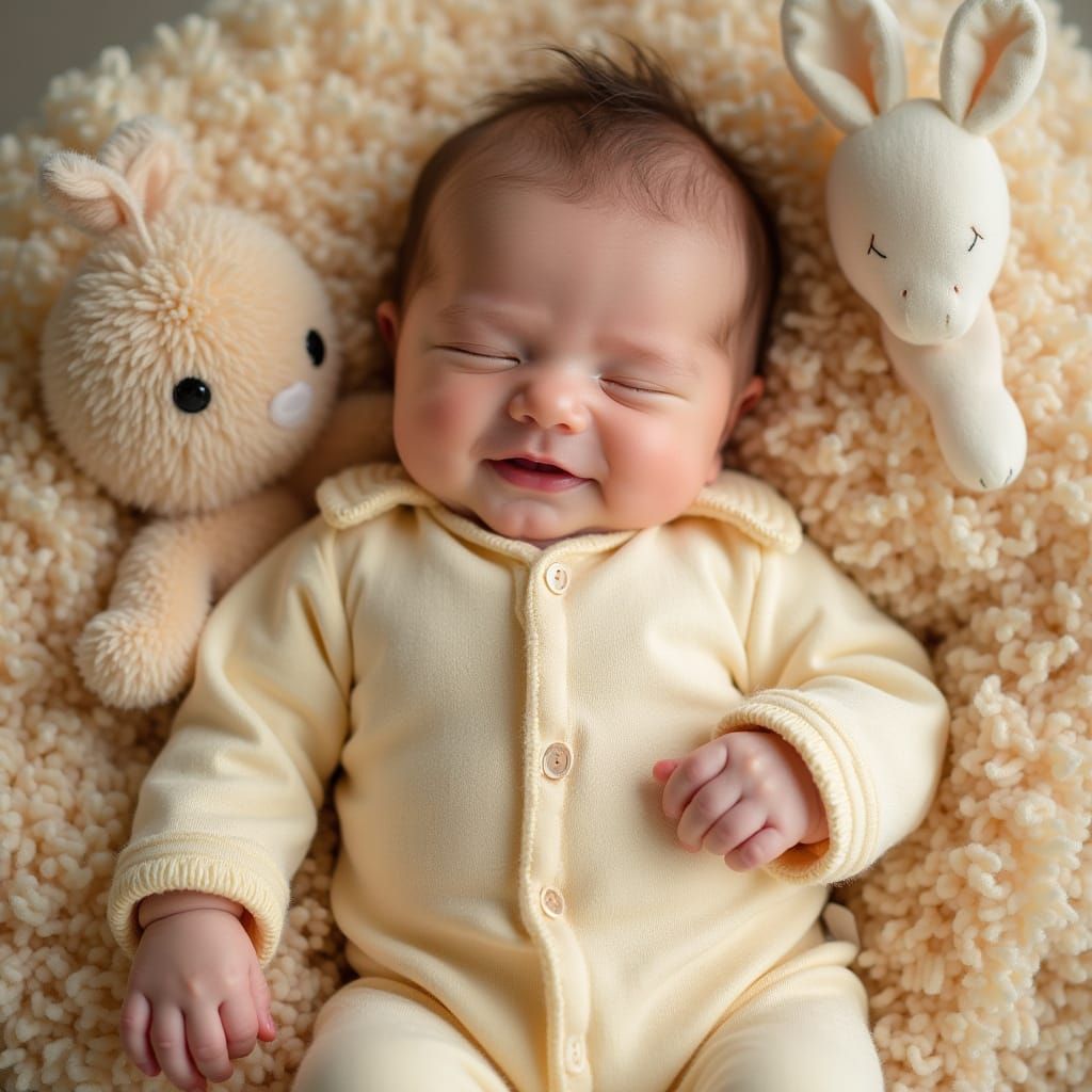 This charming image depicts a serene newborn baby surrounded by soft toys and snuggled up in a plush pastel blanket, exuding a sense of gentle warmth and whimsical wonder, reminiscent of classic children's book illustrations and modern minimalist art.