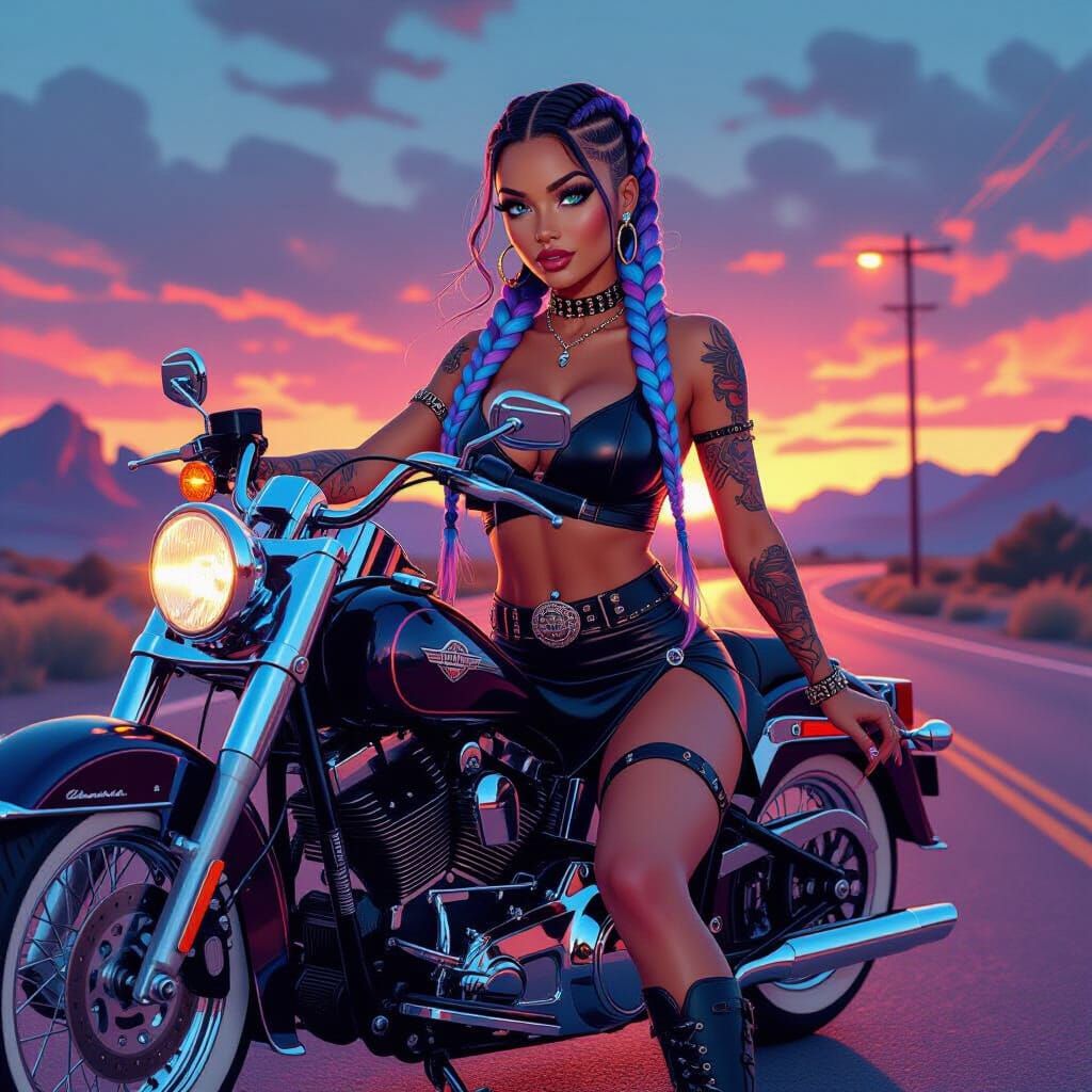 A vibrant image of a woman with braided pastel hair, shaved on one side, sitting on a vintage motorcycle. She wears a black leather outfit, complemented by a sapphire piercing, in a synthwave aesthetic.