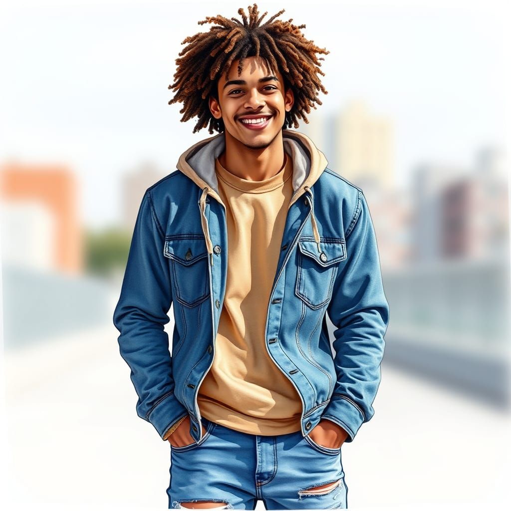 This image depicts a man with afro pigtails, wearing a hoodie and ripped jeans, standing in a casual outdoor setting with a subtle smirk on his face.