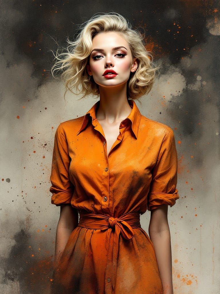This image features a 1950s pin-up woman in an orange dress, rendered with fluid ink splatters and smoky gradients. The art style blends watercolor textures and expressive brushwork with atmospheric depth.