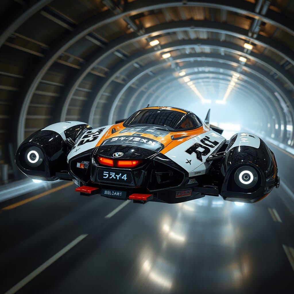 photo photorealistic photographic realism aerial 3D angled photo of a far future flying floating soaring cyber tech sport hover-speeder with huge sporty future logos with chunky Japanese lettering with rounded edges. aerodynamicly designed plastic multicolour and black colour block sections with forward ...
