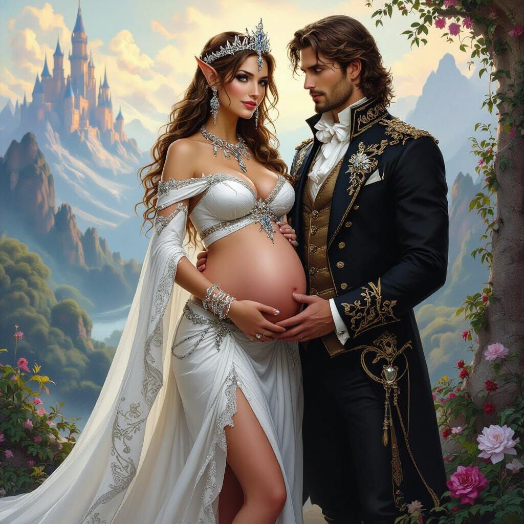 This image depicts a regal pregnant elven queen in ornate attire and jewelry, with her human husband in formal wear, set against a majestic fantasy backdrop with lush colors and fine details.