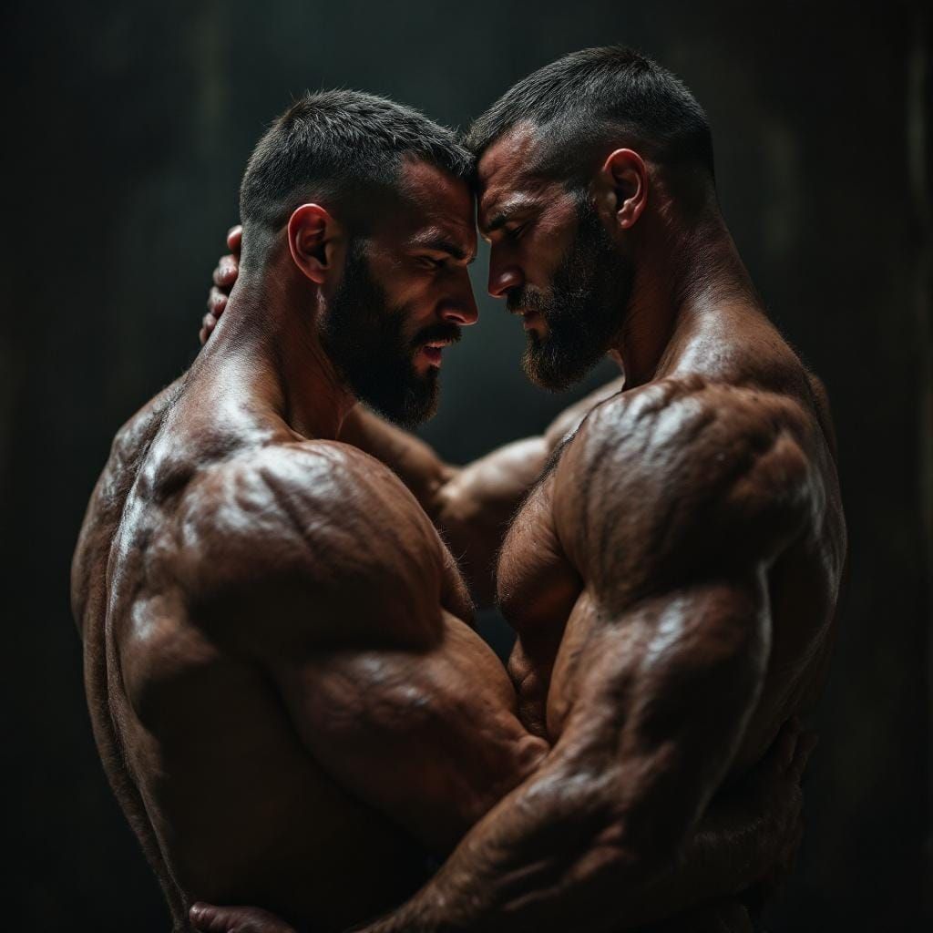 This image shows two muscular, shirtless men embracing. The men are sweaty and wearing speedos, captured with cinematic lighting and film grain for a dramatic, hyperdetailed effect.
