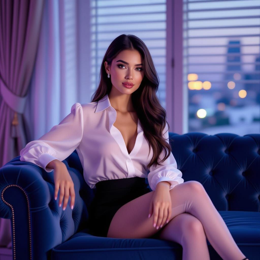 This photorealistic image shows an attractive young woman with dark hair and fair skin posing on a blue velvet couch. She wears a white sheer blouse and black shorts, with a blurred cityscape visible through a window, all in soft purple light.