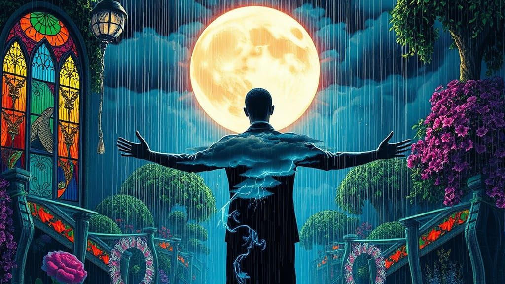 This striking image shows a solitary figure within a surreal garden, featuring stained glass and shimmering rain. Digital distortions create a futuristic, dreamlike aesthetic inspired by abstract expressionism and surrealism.