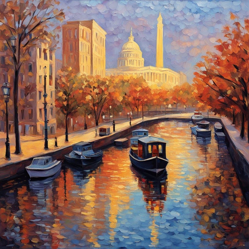 A vibrant impasto painting of Washington D.C. during the golden hour. Thick layers of colorful textured paint and expressive brushstrokes capture the city in a neo-impressionistic style.