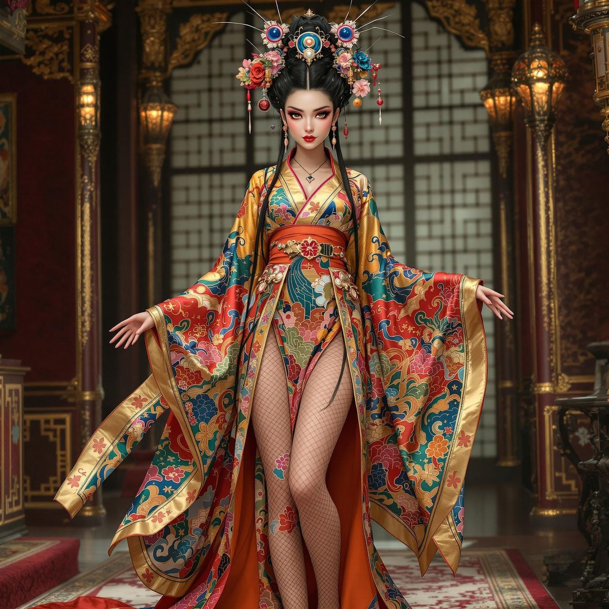 This image shows a Shinto priestess in a vibrant silk robe, standing in an opulent room. The character design is expressive, with intricate details and a futuristic realism.